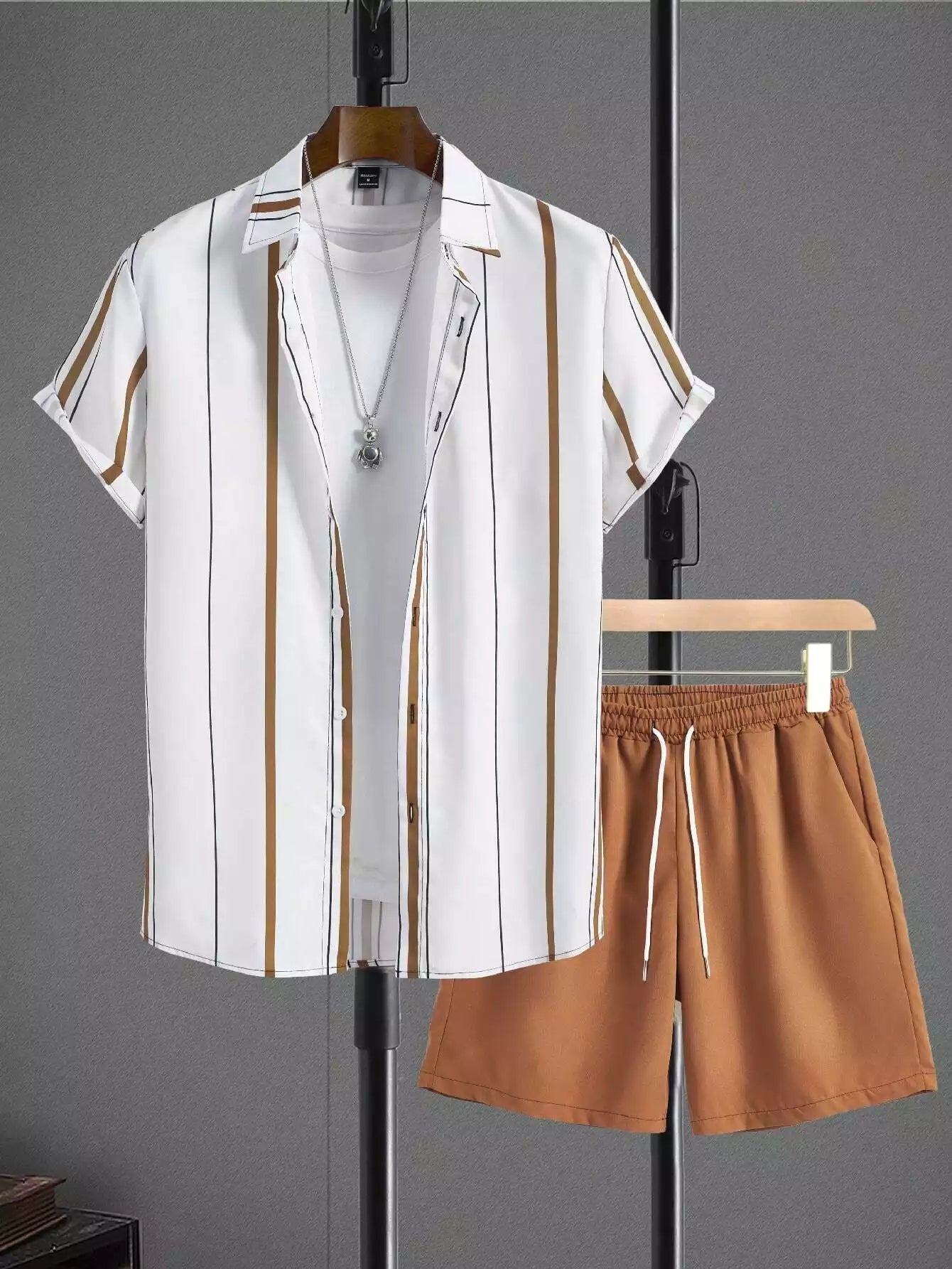 Cream Brown Line Design Mens Half Sleeves Cords Cotton Material