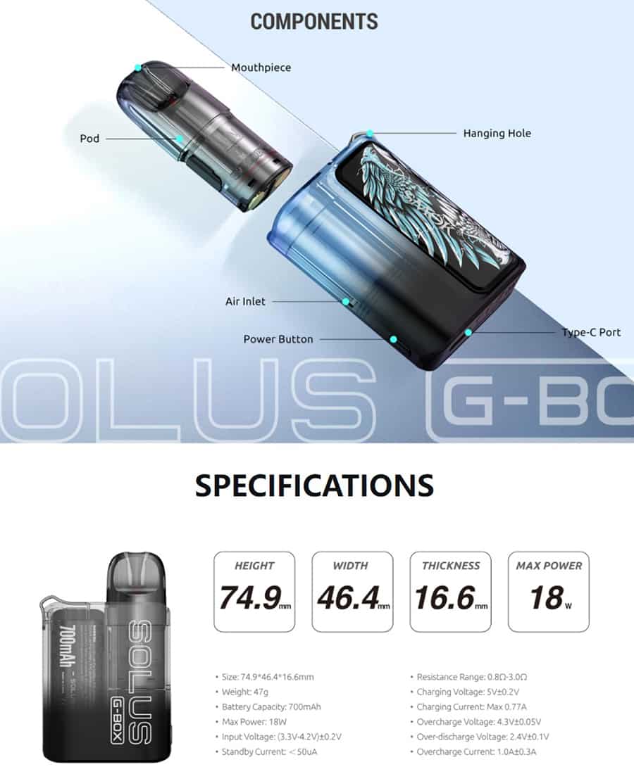 SMOK SOLUS G-BOX Kit features a 700mAh internal battery with max 20W output, compatible with a Solus refillable 0.9ohm pod cartridge that accommodates 2.5ml of vape juice. The 5-20W output range and the airflow draw-activity mode are suitable for the vaper who loves MTL or RDL vaping mode. The PCTG material ensures lightweight while making G-BOX more robust and durable. The pod designed with a magnet design for easy replacement helps to lock and can securely without loosening, making the coil heat quickly. It is equipped with a Type-C charging port that you can enjoy a nice flavor after only 15 minutes of charging.
